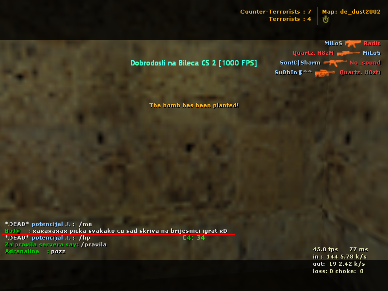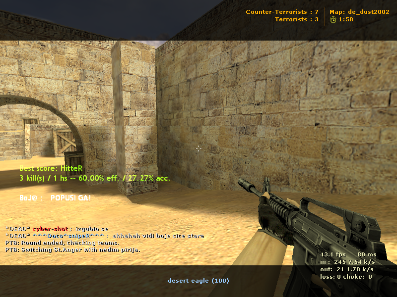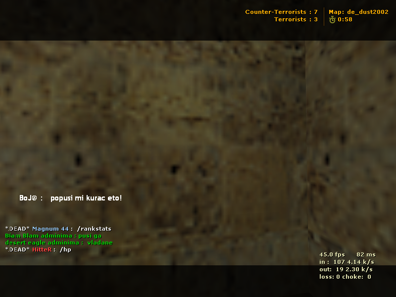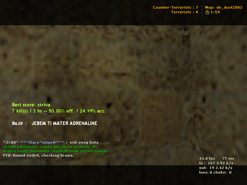 Admin VakiC posto nema ban komandu, mora da me kick i psuje mi sve jer navodno imam WH, jer mu je neki igrac h. to rekao, a naravno nije me spec. ni jednu rundu. I mislim za prozivanje da ide kazna igracu koji proziva a ne meni. Ako je problem sto ubijem tog "prejakog" h. dvije runde zaredom mora li znaciti da imam Wh, pa nije taj covjek izmislio kanter.