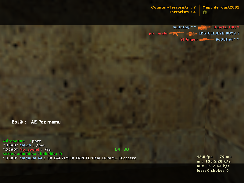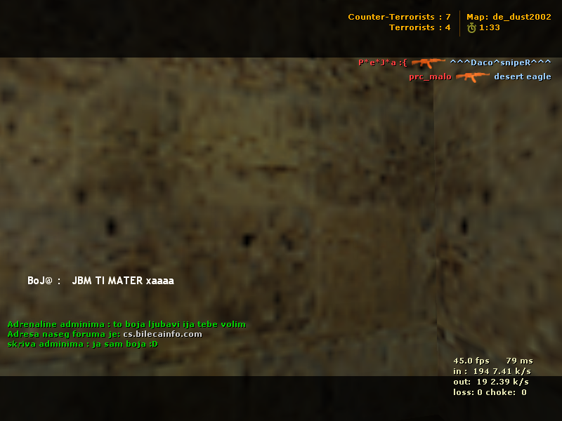 ma moze se skontat ugl. lik drka kurac na igracima nicim izazvan a i Boja je isti lik je debil nevidjen.Pises na chat znaci nevezano za njega on odjednom ne smaraj banovacu te.Ja mu kazem sta sam tebi reko jesi normalan.On kick jedno 10 sta mu rec,opsovat mu ban cu dobit.I cudite se sto nema dobrih igraca na serveru malo se zapitajte.